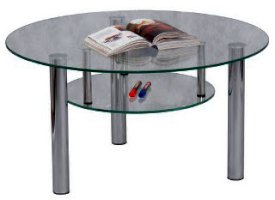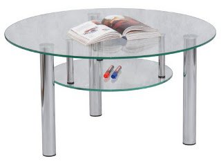 Журнальный стол - стеклянная круглая столешница с полкой, ножки металлические с фетровыми подпятниками.