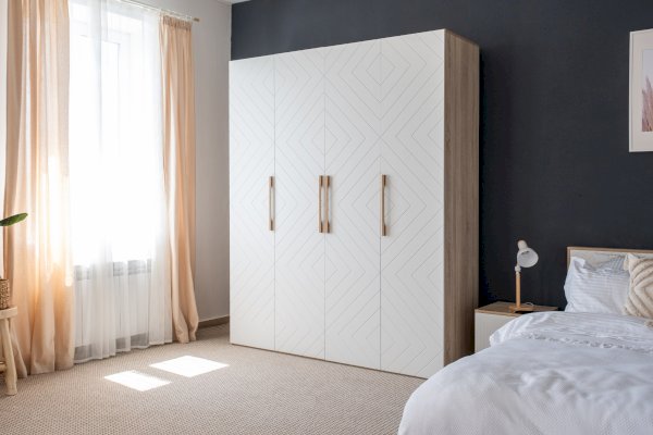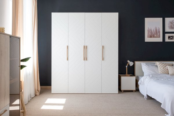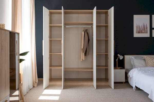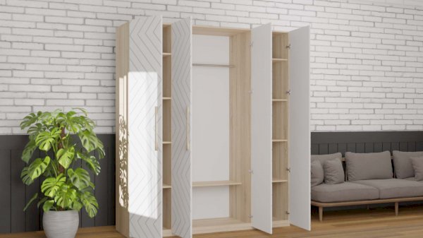 Шкаф для спальни или гостиной имеет важное практическое значение. Данная модель оснащена 4-мя распашными створками, за которыми скрыто 3 отделения: 2 боковых с вместительными полками под сложенную одежду или белье, центральное с 2-мя полками и штангой для одежды на плечиках.