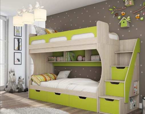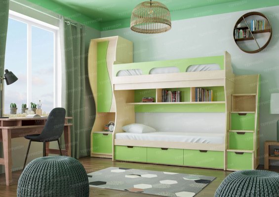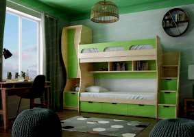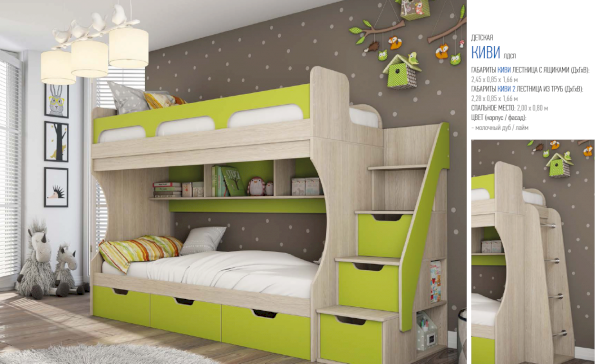 Атмосферу счастья и беззаботности приносит в дом детская «Киви». Сочетание оттенков лайм и дуб молочный выглядит очень жизнерадостно. Малышам нравится отдыхать и играть в такой комнате. Они с удовольствием спят на двух- или одноярусной кровати, хранят вещи в шкафу и на стеллажах, убирают игрушки в специальную тумбу и учат уроки за удобным письменным столом.