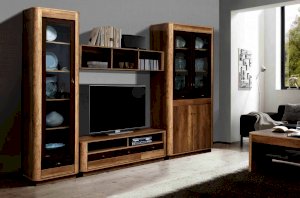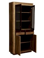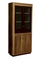 Комбинированный шкаф не зря получил такое название. Он сочетает в себе и витрину, и комод, и тумбу! Модуль разделен на несколько частей, у каждой из которых – свои задачи. Верхняя часть шкафа представляет собой витрину: две распашные стеклянные дверцы заключены в изящную рамочную конструкцию, открываются навстречу друг другу, а внутри – три широкие и глубокие полки из ЛДСП, каждая из которых выдерживает вес до 5 кг. Можно поставить фамильный сервиз или книги. Под отсеком-витриной находятся два выдвижных ящика. Они предназначены для документов и других бумаг. Под ними тоже находятся две полки с распашными дверцами, но в отличие от верхней части – эти дверцы с закрытыми фасадами.