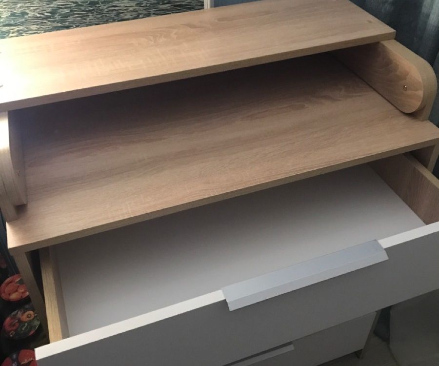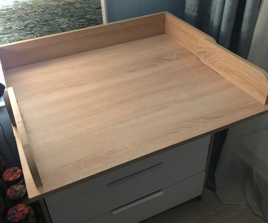 - внешний вид. Цвет дерева полностью вписался в интерьер. Понравились ручки на ящиках; - большой пеленальный столик. Он довольно широкий, механизм вроде крепкий. В крышке комода изначально отверстия под пеленальный столик не сквозные, поэтому можно использовать комод без столика. Чтобы закрепить столик, нужно просверлить отверстия.