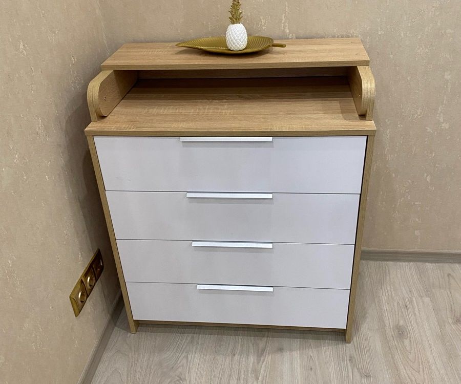Комод пришел быстро, все целое без значительный сколов. Не было креплений и комментариев по сборке верхней части комода. Докупали крепления ( так называемые уголки). Ну а в целом комод для своей цены очень приличный.