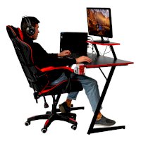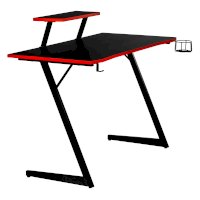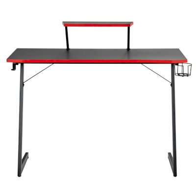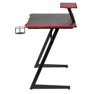 Конструкция простая и прочная: стальная рама выдержит серьезную нагрузку (заявлено до 200 кг). Стол на двух L-образных опорах впишется в любой уголок дома, его легко перемещать, удобно собирать и  разбирать. Несмотря на лаконичность дизайна, он очень стильно смотрится: строгая черная столешница «под карбон» отделана красной кромкой.
