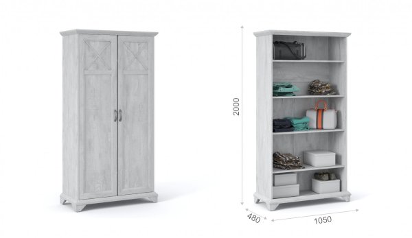 Распашной двухдверный шкаф выполнен в популярном стиле неоклассика – белые рамочные фасады с фактурой и рисунком натурального дерева, декоративные крестообразные накладки, фигурные ножки и карниз все это придает комнате элегантный и светлый вид. Вместительное отделение с полками поместит в себя одежду, коробки с обувью и головные уборы. Мебель выполнена из экологичных материалов.