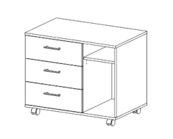 Тумба с хорошей вместимостью, имеет три выдвижных ящика полного выдвижения, открытые полки. Колесные опоры придают модулю необходимую мобильность.