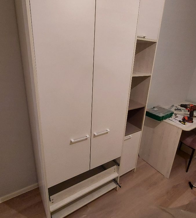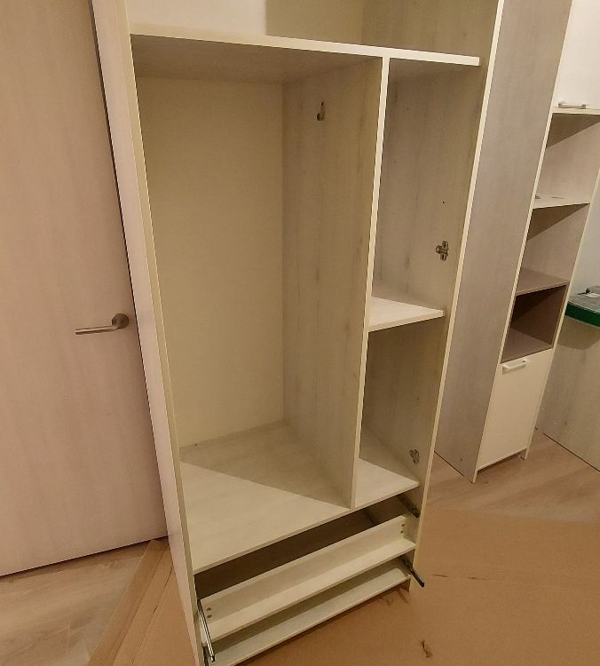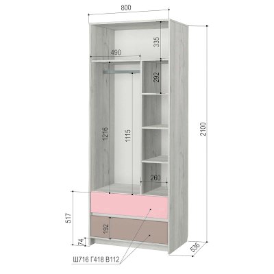 Внутреннее наполнение: шариковые направляющие (2 выдвижных ящика), петли с доводчиком, штанга для одежды, полки