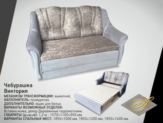 Диван Чебурашка Виктория 1,2 (Асм) - за 29 737 руб. в Великом Новгороде. Купите на сайте velikij-novgorod.onlinemarketmebeli.ru или по телефону 8(800)505-30-63 уже сегодня! Уточнить наличие, комплектацию, актуальную цену можно бесплатно у менеджера ежедневно. Закажите Диван Чебурашка Виктория 1,2 (Асм) до конца акции! Доступна покупка в кредит, рассрочку. Доставим со склада или на заказ.