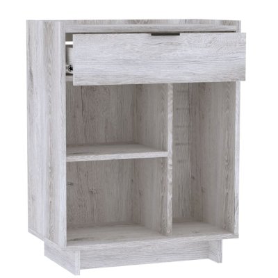 Тумба с ящиком ФЛЕКС 27 в светлом цвете Дуб Шавиниган выполнена из ЛДСП класса эмиссии Е1 толщиной 16 мм. Напольная тумба с выдвижным ящиком на шариковых направляющих и открытыми нишами разного размера. Бортики по краям столешницы предотвратят падение предметов. Предусмотрена универсальная сборка тумбы.