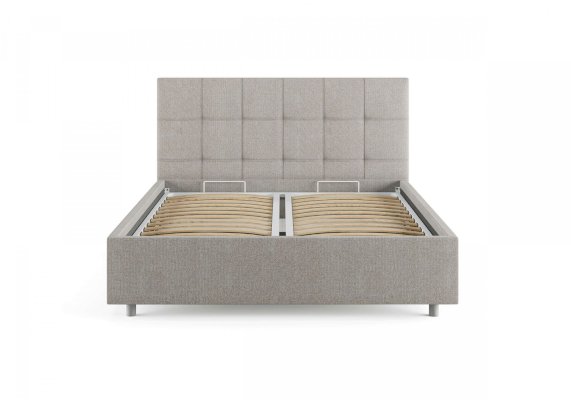 Лаконичная интерьерная кровать с изголовьем, украшенным декоративной строчкой. Модель изготовлена из ДСП. Обратная сторона изголовья обита темно-серым спандбондом, но, при желании, её можно выполнить из основного обивочного материала. В комплект кровати входит кроватное основание. Каркас основания выполнен из металла, ламели - из берёзы. При необходимости в комплект можно включить подъемный механизм с бельевым ящиком, который существенно увеличит объем хранения вещей,  а так же позволит легко производить уборку пыли под кроватью.