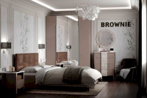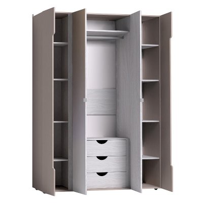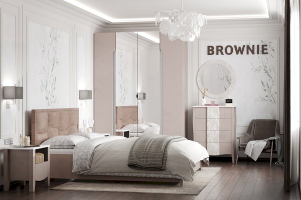 Вместительный четырехдверный шкаф для одежды и белья Brownie 777 с зеркалами во весь рост функциональный и эргономичный модуль. Его крайние фасады без лицевой фурнитуры открываются за фигурный вырез. Планка, в декоре Ясень Анкор светлый, крепится к корпусу шкафа, предотвращая попадание пыли. Также она выполняет декоративную функцию, визуально объединяя шкаф с другими модулями спальни, которые выполнены с брашировкой. Внутренние отделения для белья регулируются по высоте полками. За центральными зеркальными фасадами - штанга и вместительные выкатные ящики с вырезами для открывания, что позволяет более рационально использовать внутреннее пространство шкафа.