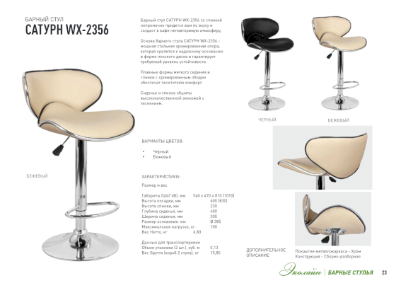 Барный стул САТУРН WX-2356 со спинкой непременно придется вам по вкусу и создаст в кафе неповторимую атмосферу. Основа барного стула САТУРН WX-2356 - мощная стальная хромированная опора, которая крепится к надежному основанию в форме плоского диска и гарантирует требуемый уровень устойчивости. Плавные формы мягкого сидения и спинки с хромированным ободом обеспечат посетителю комфорт.
