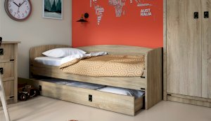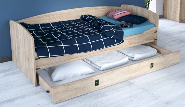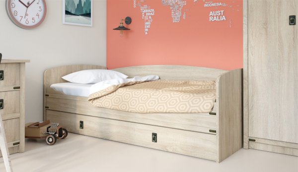 Кровать-тахта – со скругленным изголовьем и высокой спинкой имеет дополнительное спальное место, с помощью множества роликов его легко выдвинуть, можно использовать как ящик для белья. Мягкая кромка 2мм защищает края кровати от повреждений и сколов. Украшением служат стилизованные металлические ручки MARINE бронзового цвета и декоративные элементы в тон. В комплекте с декоративным матрасом и подушками превращается в молодежный диван. Пользоваться кроватью может взрослый и ребенок любого возраста, так как она имеет размеры стандартной кровати 90х200см, устойчивую конструкцию и нейтральный для интерьера цвет. Идеально компонуется со всеми модулями системы Валенсия.