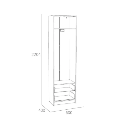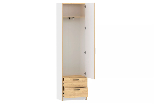 Шкаф оснащен полкой для хранения вещей, двумя выдвижными ящиками с шариковыми направляющими, за счет которых они выдвигаются плавно и бесшумно, а также выдвижной штангой, которая позволяет комфортно размещать предметы гардероба. Шкаф является модульным, что позволяет комбинировать его с другими шкафами и тумбами из одноименной коллекции. Лаконичный дизайн шкафа гармонично подчеркивается черными ручками.