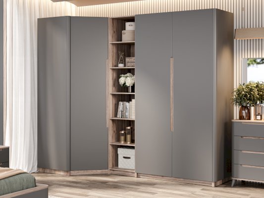 В этой спальне воплощены лучшие черты современного европейского дизайна! Теплой и уютной делает спальню сочетание двух текстур: древесная и матовый белый или оникс серый. Округлые, мягкие линии мебели создадут атмосферу покоя в спальне, а отсутствие острых углов обеспечат безопасность. Шкафы собираются по принципу бесконечного шкафа - это мебельный конструктор, из которого можно собрать свой шкаф мечты, где для каждой вещи найдется свое место.