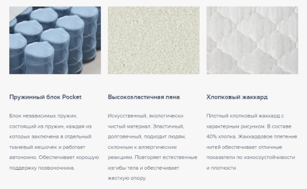 Матрас сделан на основе блока независимых пружин Pocket, плотностью 500 пружин на спальное место, снимает нагрузку с позвоночника и качественно поддерживает область поясницы. Современный гипоаллергенный материал Foam придает комфорт. Чехол матраса изготовлен из практичного и дышащего хлопкового жаккарда.